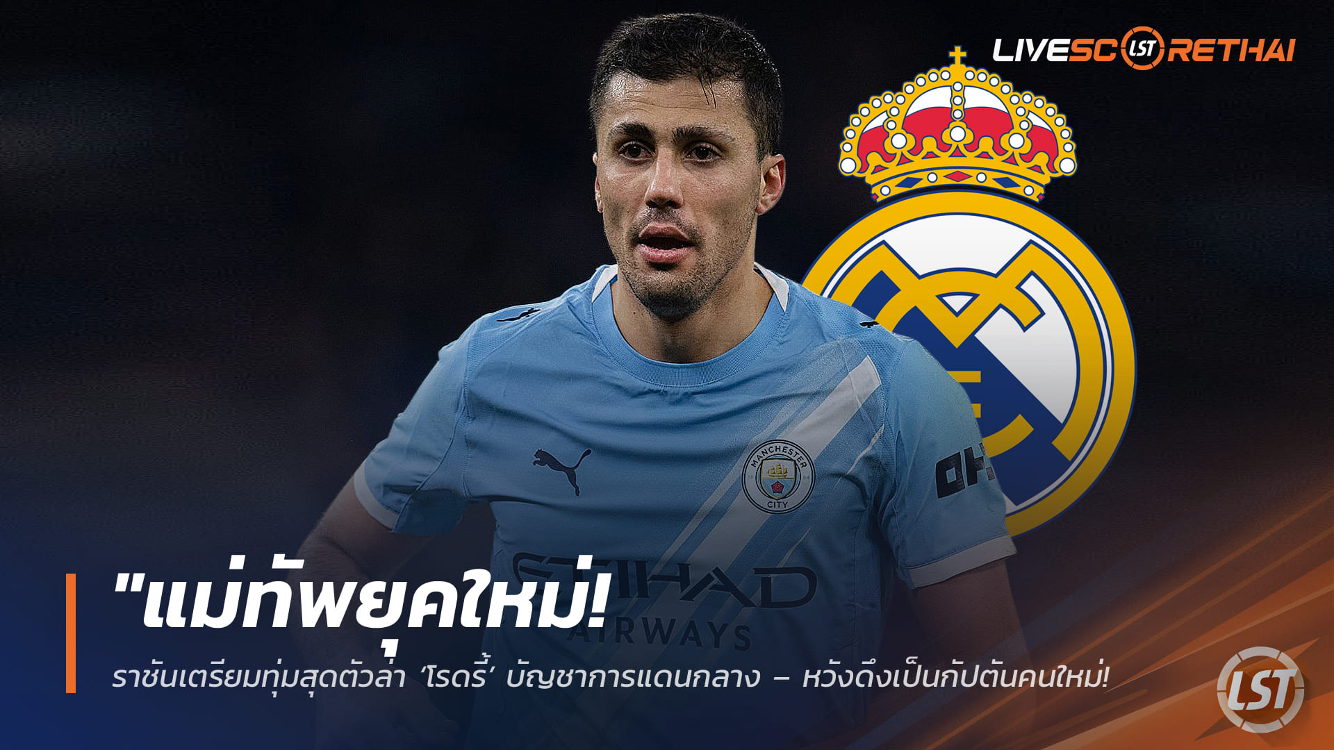 เป้าหมายเบอร์หนึ่ง: เรอัล มาดริด กำลังเร่งแผนคว้าตัว โรดรี้ มิดฟิลด์วัย 29 ปี ดีกรีเจ้าของรางวัลบัลลงดอร์จาก แมนเชสเตอร์ ซิตี้ โดยมองว่าเป็น "จิ๊กซอว์ที่ขาดหายไป" ในการก้าวขึ้นมาเป็นผู้นำทีมคนใหม่